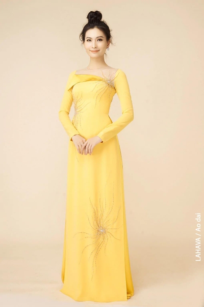 Áo dài vàng tạo hoạ tiết cườm trẻ trung